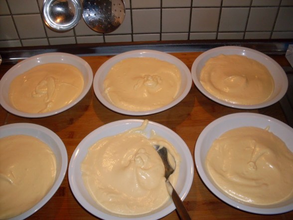 - За да разпределя този крем на шест равни части използвах шест еднакви дълбоки чинии. Не разполагам с шест еднакви купички, а пък чаените чаши ми се сториха малки по размер. По този начин блатовете ще бъдат с еднаква дебелина.