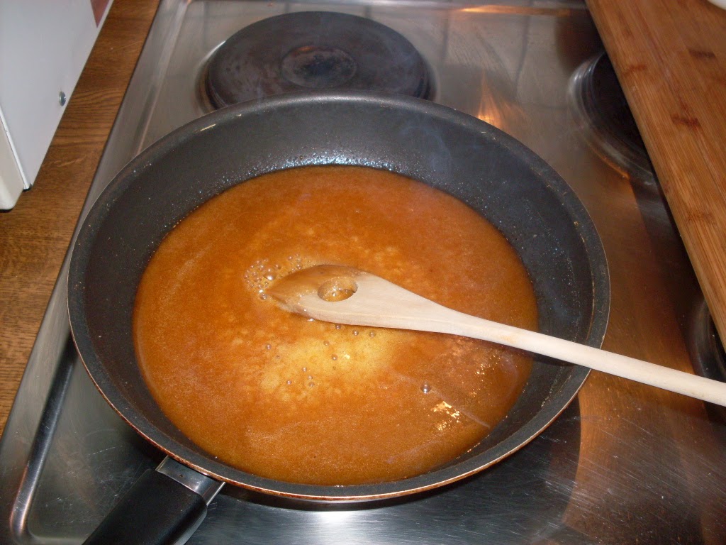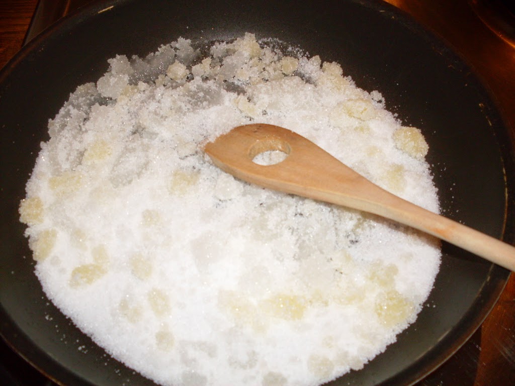 - Слагам на горещ котлон да се разтопи захарта до тъмно златист карамел.