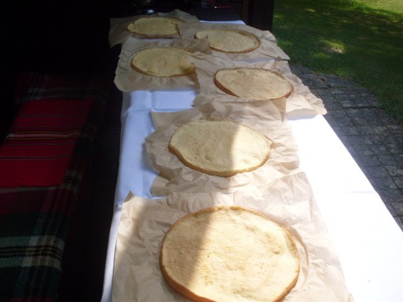 - Измивам обръча на формата за торта, подсушавам и отново подготвям с хартия за печене. Изливам втората доза, подравнявам и пека. Така – докато получа шест еднакви блата за торта.