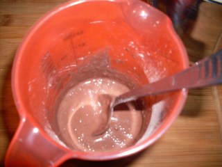- През това време изсипвам пакетчето пудинг в купичка и заедно с две лъжици захар и шест лъжици студено прясно мляко разтварям, докато се получи еднородна смес.