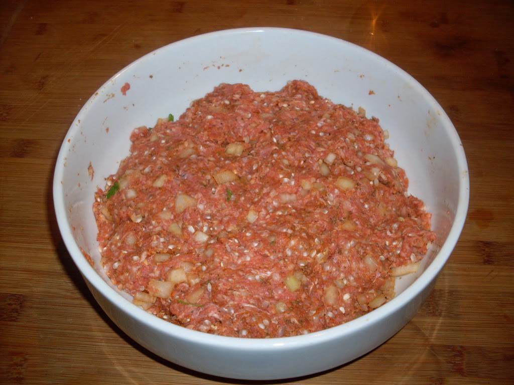 - В подходяща купа сипвам всички продукти – кайма, ориз, ситно нарязан кромид лук, само 1/2 от червения пипер, черен пипер, пресен магданоз и чубрица.