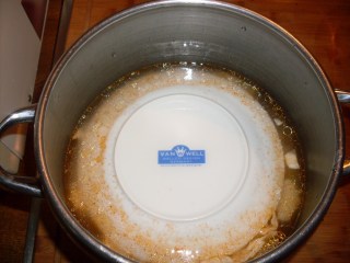 - Похлупвам и притискам с подходяща по размер чиния, чието дъно е обърнато нагоре. Това го правя с цел – да не се разтворят сармичките по време на варенето.