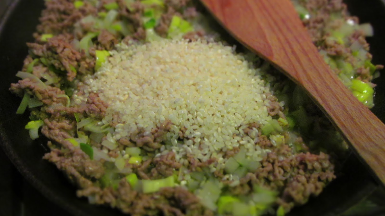 - Добавям ориза и половин чашка вода и пържа до поемането на водата.