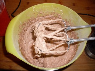 - Всички продукти за тестото, без черния шоколад, смесих в купата и разбих с миксера на максимална скорост докато се получи пухкав крем.