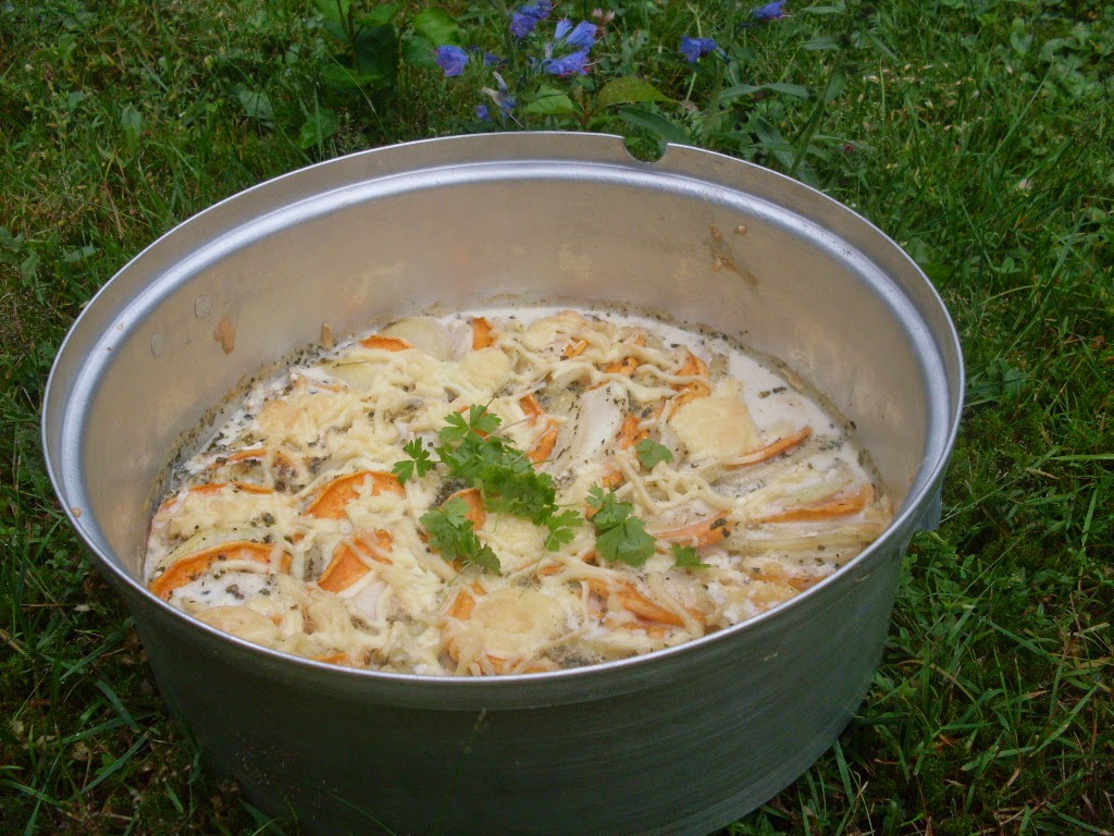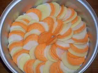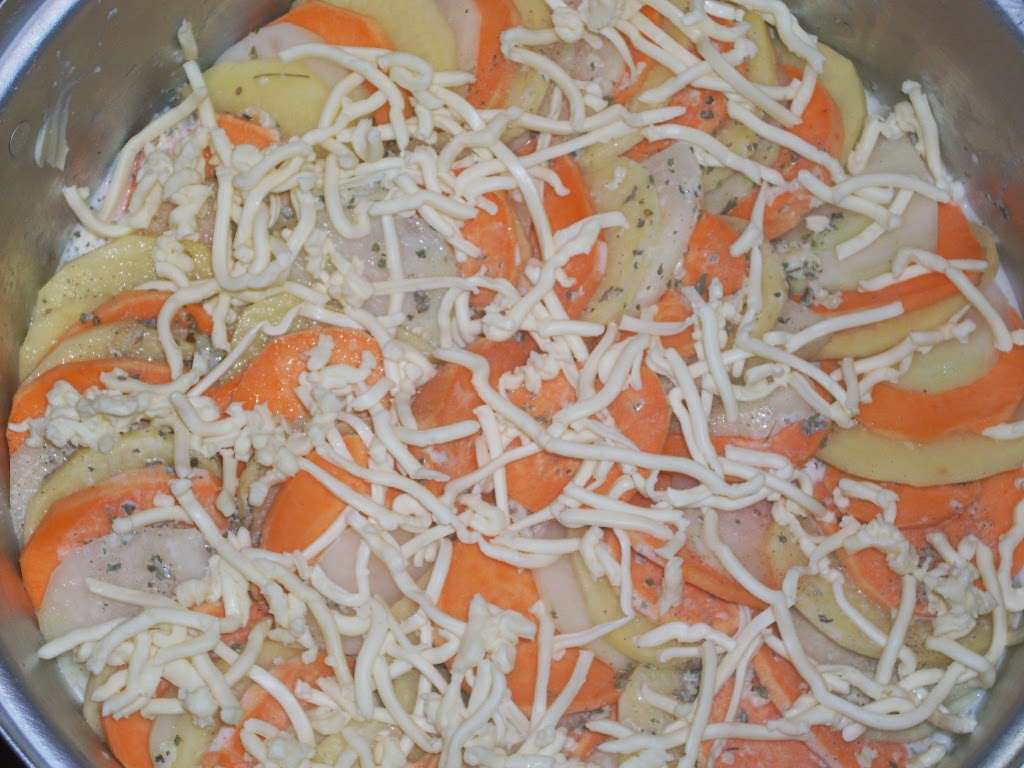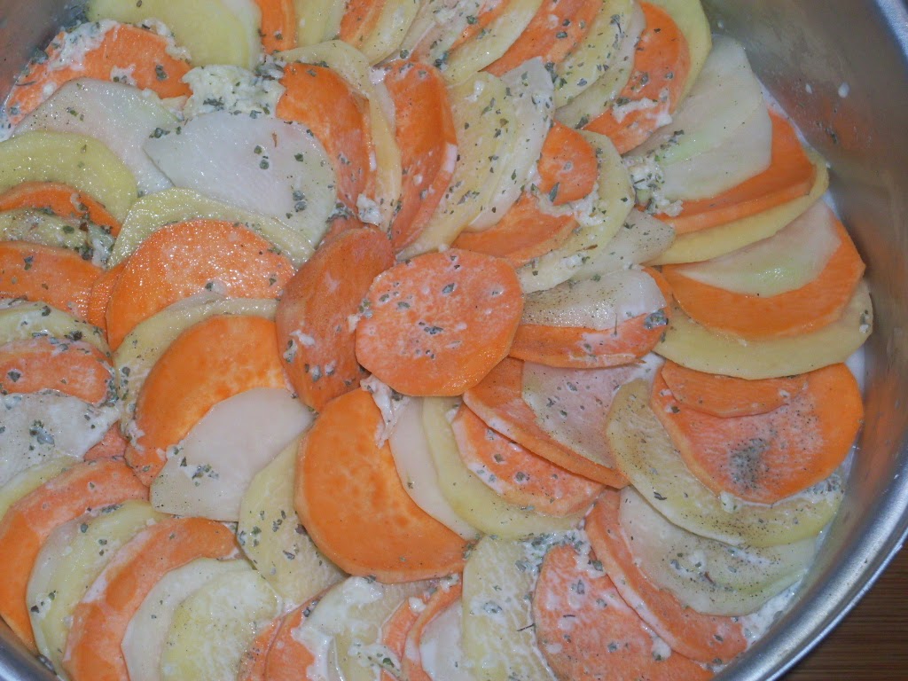 - В подходяща тавички или форма за гратен, нареждам последователно сладък картоф, обикновен картоф, алабаш, докато свършат.