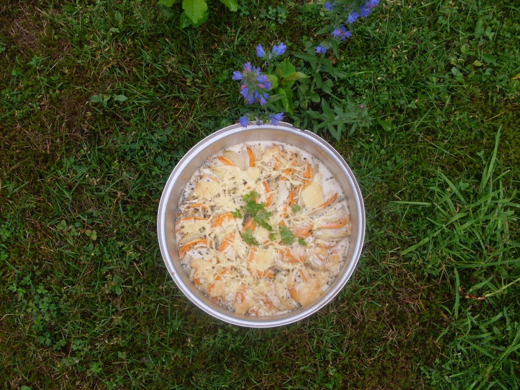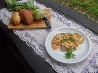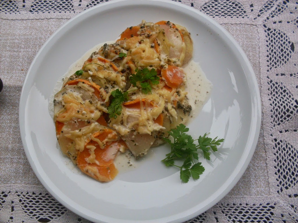 Много отдавна исках да пробвам тези сладки картофи, които се продават тук. Аз лично се запознах с този сорт на картофите в Германия. Те са много по-тъмни на цвят от нормалните картофи, които ние познаваме, а когато се обелят цветът им е прасковен или светло оранжев. След обелването, на мен лично на пипане ми заприличаха на тиквите. Но вкусът им е наистина различен, но в никакъв случай сладък. Нямам педстава защо носят името – сладки картофи. В този гратен сладките картофи са комбинирани с обикновенни картофи и с алабаш. За алабаша вече бях писала в предишна моя публикация Пълнен алабаш или Kohlrabi. Основната подправка, използвана в гратена е риган.