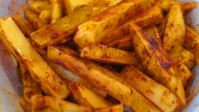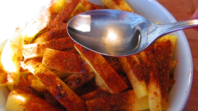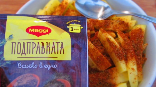 - Изсипвам картофените пръчки в купа и поръсвам с ПОДПРАВКАТА.