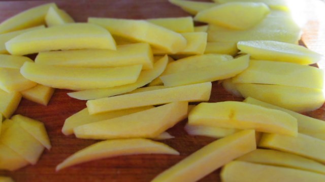 - Обелвам картофите. Нарязвам ги на филийки по дължина и тогава всяка филийка нарязвам на пръчки с дебелина около 1 см.