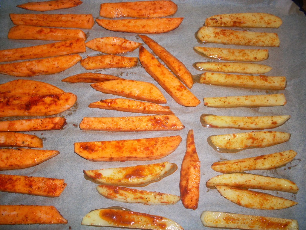 - Подреждам картофените пръчки в тавичката на фурната, предварително покрита с хартия за печене.
