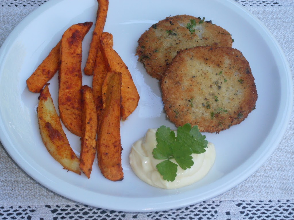 Гарнирам шницелите с картофени пръчици и майонеза.