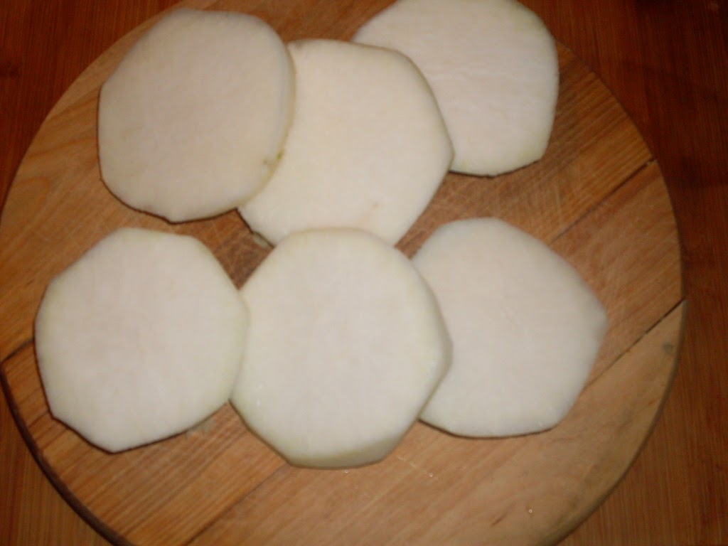 - Алабашът го изчиствам от листата, обелвам и измивам. Нарязвам го на филийки с дебелина около 1,5 см.