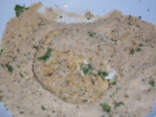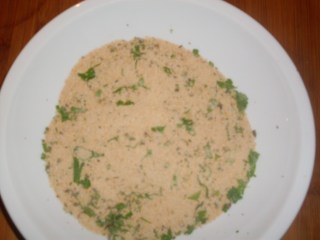 - Смесвам брашното за паниране със зелените подправки и кората на лимона. Добавям сол и черен пипер на вкус. Разбърквам добре.