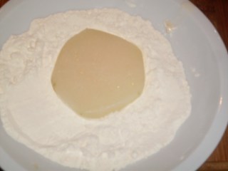 - Изцедените и изстинали филийки алабаш овалвам в брашното и изтупвам от излишното брашно.