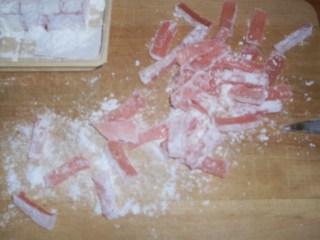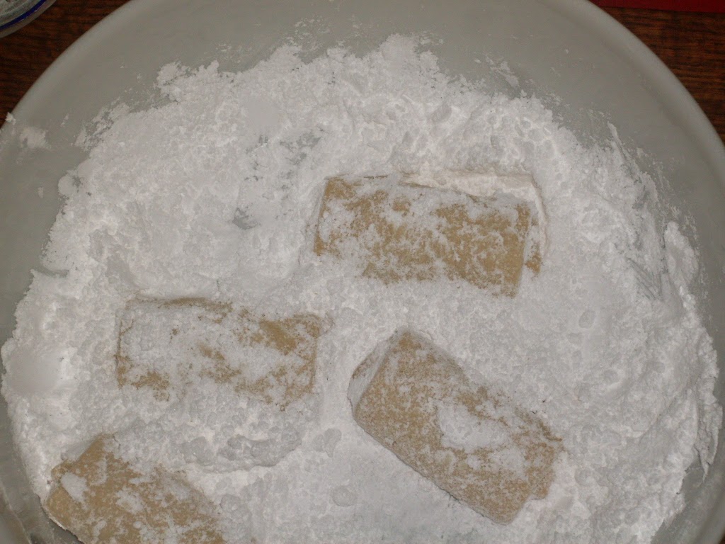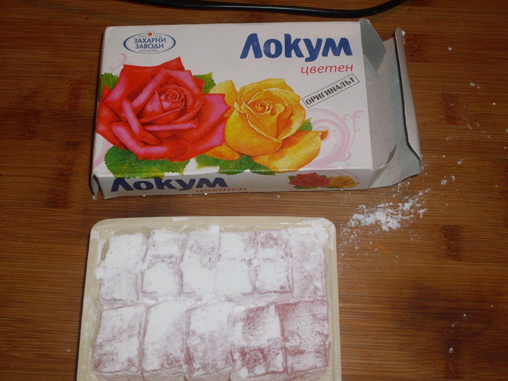 - Локумът разрязах на продълговати лентички. Това става: като едно кубче локум режа на три филийки по дължина и всяка филийка режа на две лентички.