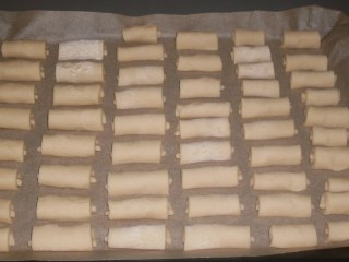 - Подреждам в тава, застлана с хартия за печене, с ръбчето на долу, като оставям разстояние между пуричките. По време на печене те леко увеличават размера си.