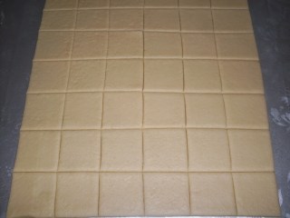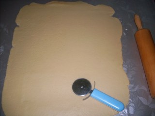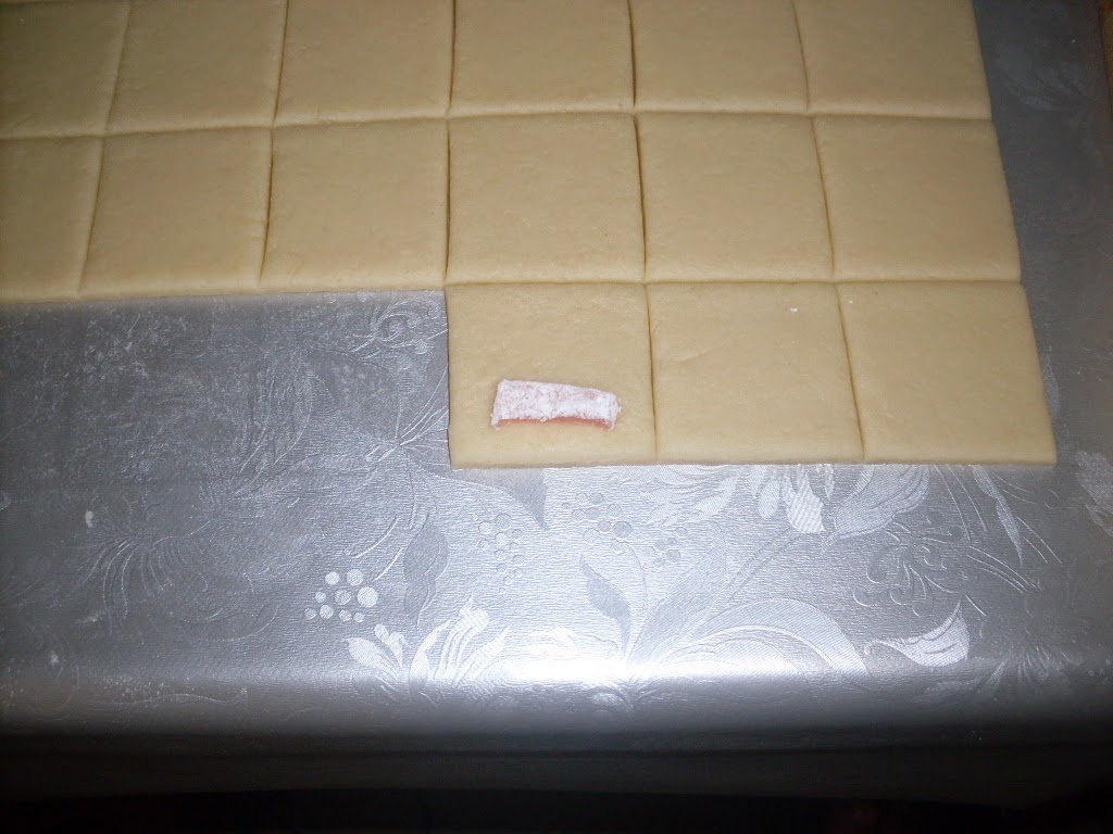 - С помощта на резеца за пици, отрязах неравните краища на кората и разрязах на горе-долу еднакви по размер квадрати.