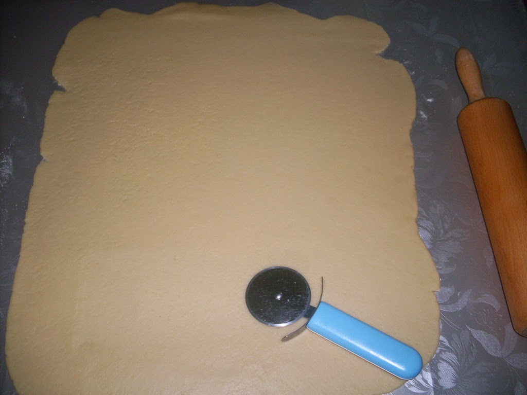 - Готовото тесто разточих на продълговата кора с дебелина около 0,5 см.