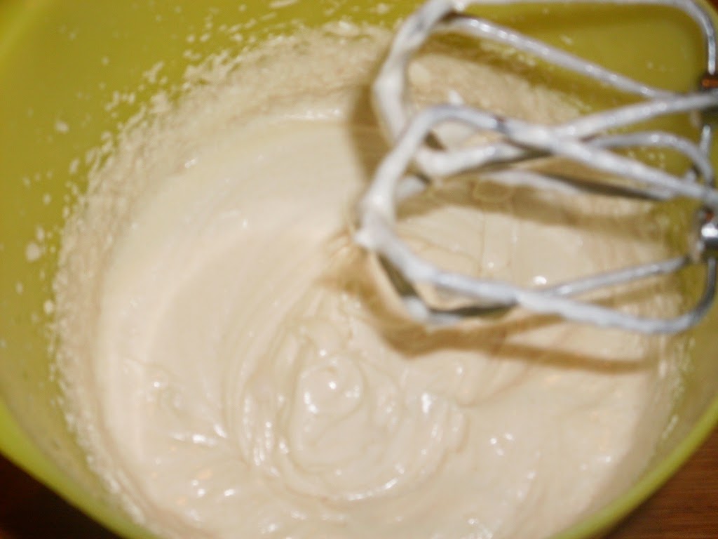- В купата за разбиване изсипах разтопената свинска мас, но в никакъв случай гореща и заедно със захарта, разбих с миксера.
