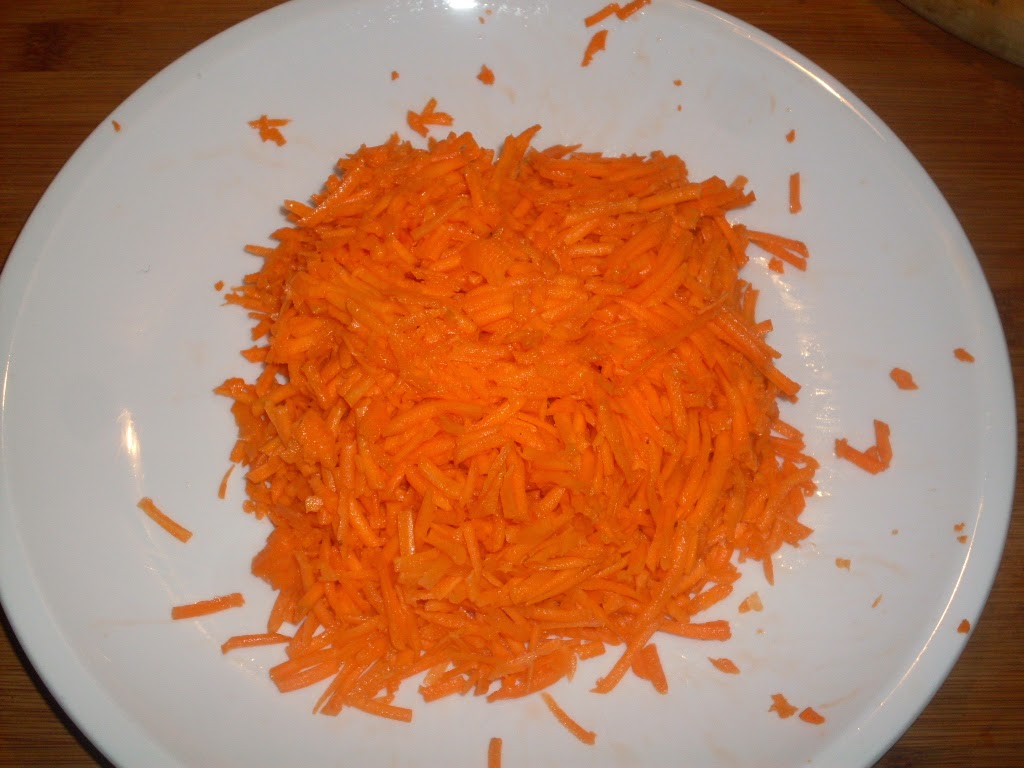 - Измих, обелих морковите и ги настъргах на среден размер на рендето.