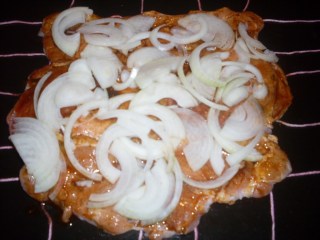 - Подреждате върху лука втори ред пържолки, но вече в другата посока, така че да се кръстосат. Намазвате с подправка, подреждате лук, пържолки, подправка, лук. Така докато свърши месото и се получи една купчинка.