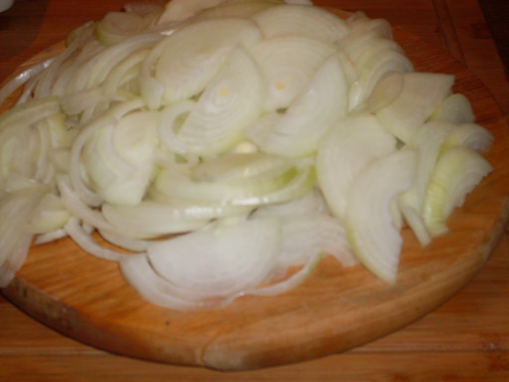 - Лукът се обелва и се нарязва на тънки филийки. Аз го режа първо на две половини и после всяка половина нарязвам на филийки по дължина.