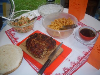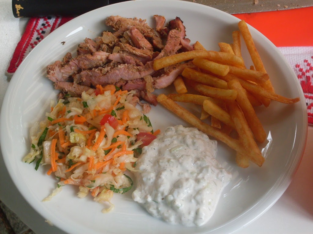 Искам първо да предупредя всички, които живеят в Гърция и имат възможност да приготвят истински гирос. Ние тук – в Германия, познаваме само немския вариант на гирос, а поради липсата на специален шиш, на който се приготвя си намерихме лесен вариант – във фурната. Искам да Ви кажа, че по никакъв начин не отстъпва на оригиналния гирос. А пък, когато се очакват повече хора на гости – идеално и оригинално ястие. Задължително го комбинирахме с