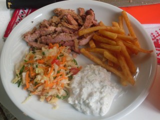 Tzatziki, Зелева салата, пържени картофки и арабски хляб по желание. Да не забравяме и узото.