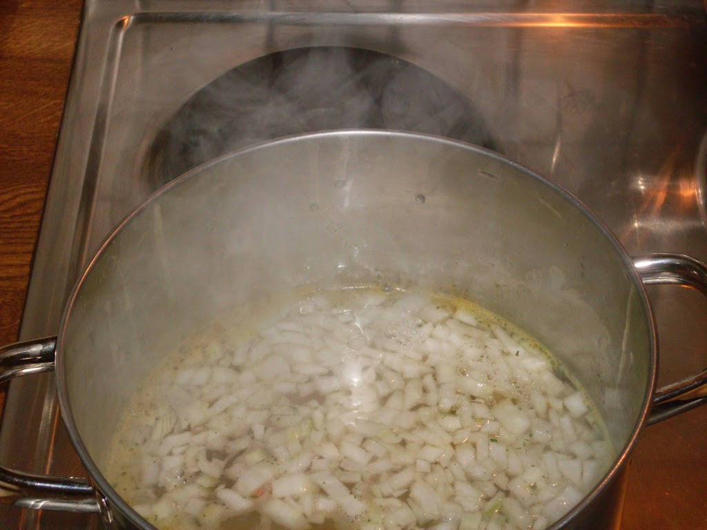 - Оставям ги да поврат на средна мощност на котлона, около 5 минути или докато поомекнат кубчетата лук.