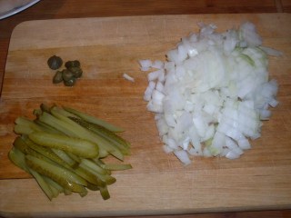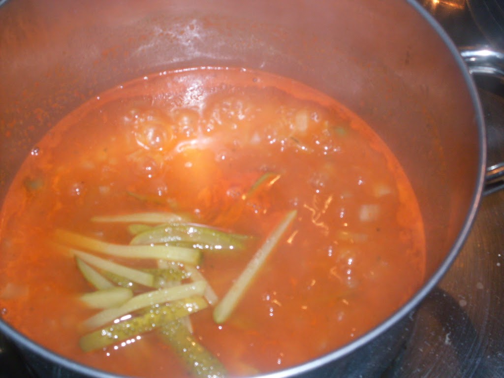 - Добавям, към леко сгъстилия се сос, лентичките кисели краставички. Котлонът продължава да е на средна степен на мощност.