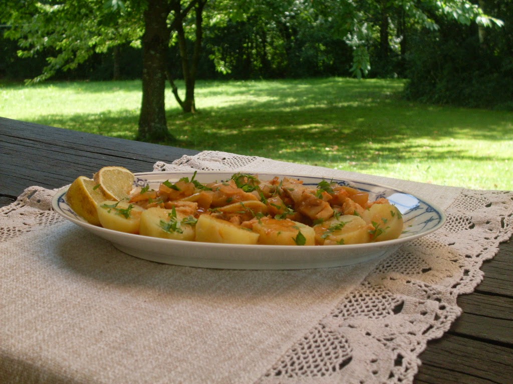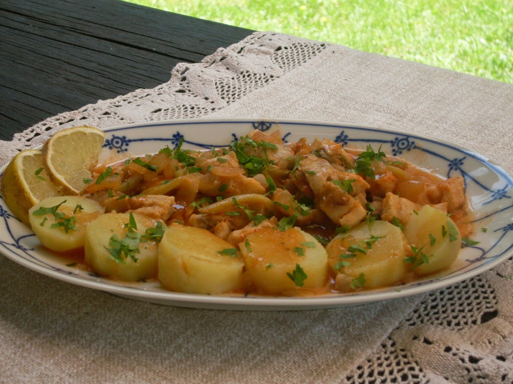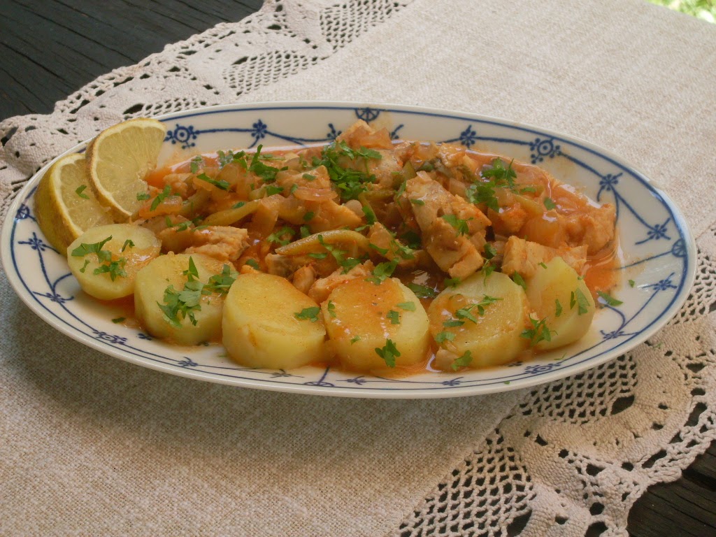 Сервирам рибата „Строганоф“ в предварително затоплени чини, гарнирам с варени картофи и поръсвам със ситно нарязания пресен магданоз.