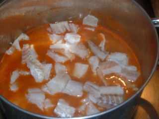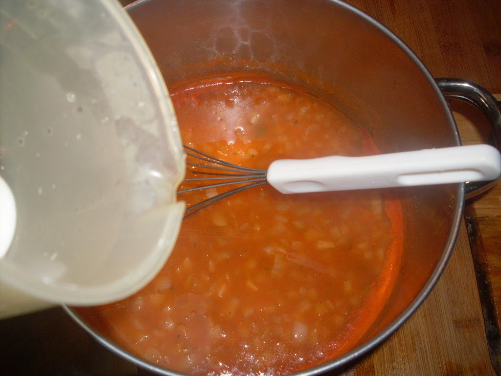 - Към врящия бульон, добавям доматеното пюре, предварително разтворено в малко студена вода, горчицата, червения пипер и сока на другата половина от лимона