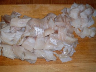 - През това време, нарязвам рибните филенца на кубчета с размер, около 2 см.