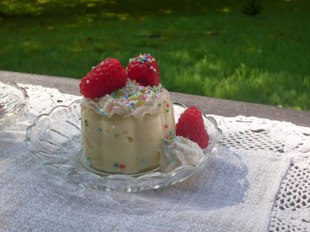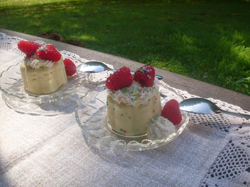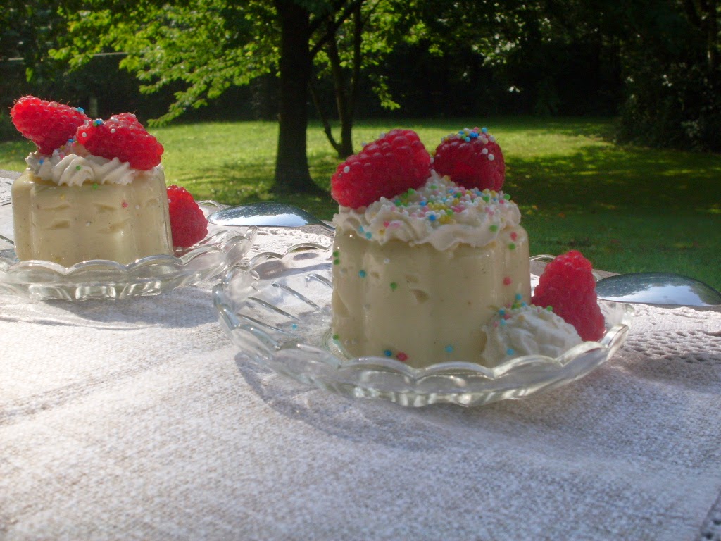 - Декорирам пудинга с разбита сметана, пресни малини и поръсвам с шарени захарни топченца, които се продават готови за декорация на торти.