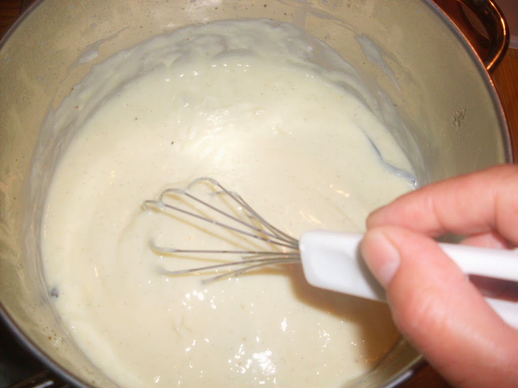 - Прясното мляко, размесено със захарта, ванилията, както и самата шушулка и маслото, слагам на котлона да заври.