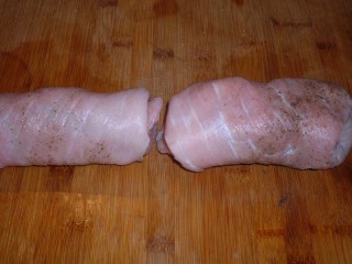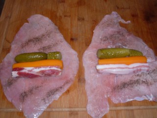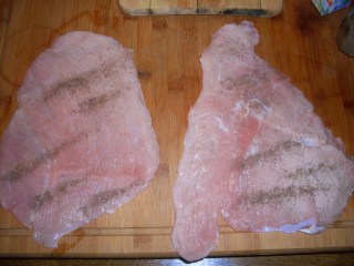 - От свинския бут се нарязват възможно най-големите по размер филии, които са с максимална дебелина 5 – 7 мм. Нарязването може да помолите и в магазина, от който си купувате месото, да го направят – на машина. Дебелината се постига и с допълнително начукване, но трябва да се внимава да не се получат дупки в месото.