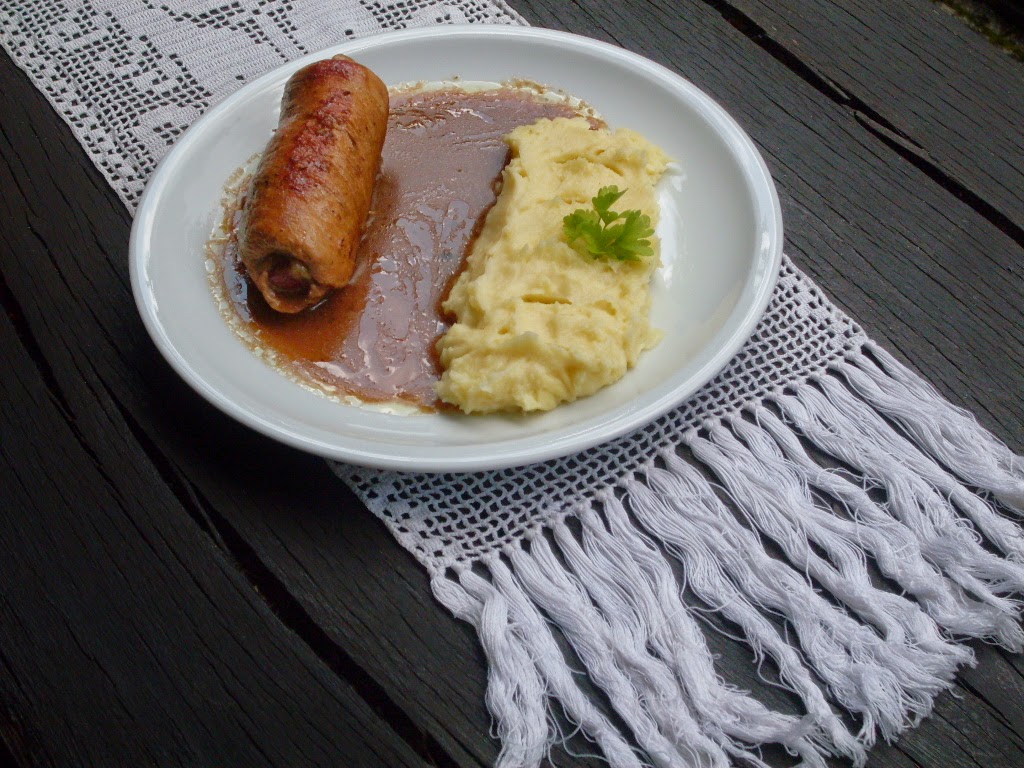 - Сервирам готовите руладини в предварително затоплени чинии с картофено пюре за гарнитура и заливам със соса.