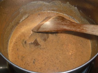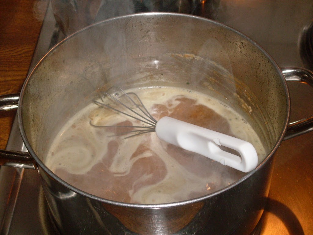 - Когато брашното добие тъмен цвят, заливам с горещия бульон и продължавам бъркането с тел за разбиване. Така соса остава гладък. Котлонът, ако е нужно намалявам на 1 степен. Важното е сосът да къкри, а не да ври.