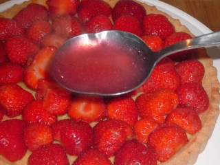 - С помощта на лъжица, заливам плодовете обилно с желатиновата смес. По принцип и 1 пакетче желатин е достатъчно, но е по-добре да се разтворят две, за да не стане така да не стигне за покриване на всички плодове и да се налага отново да се вари, допълнително количество. На мен ми остана от сместта за това количество ягоди.