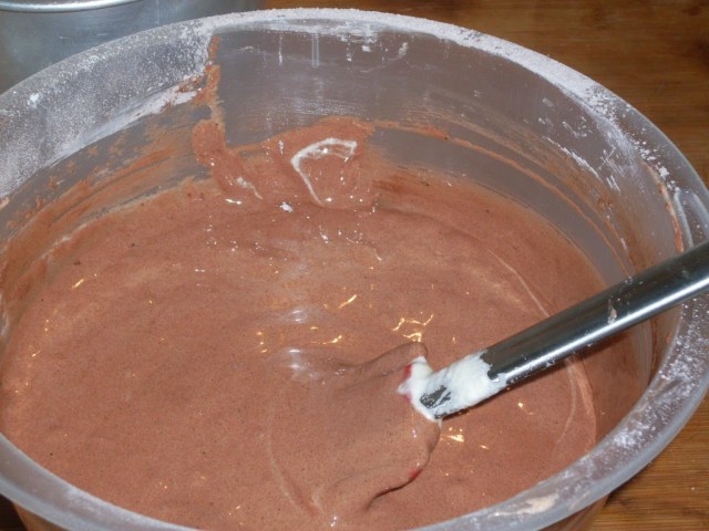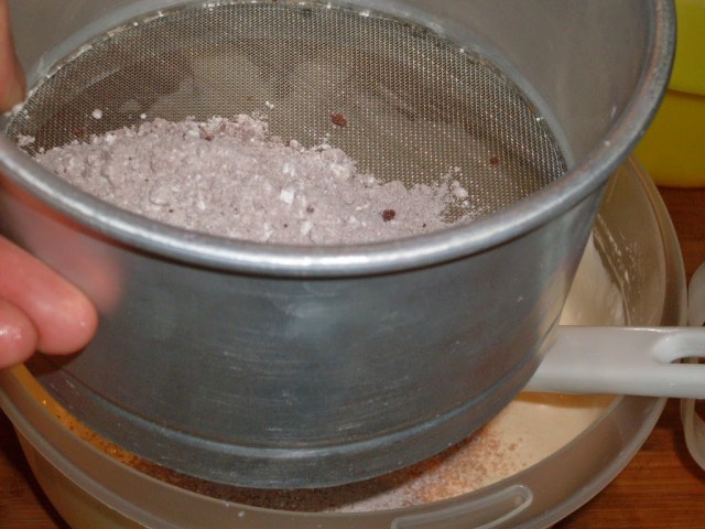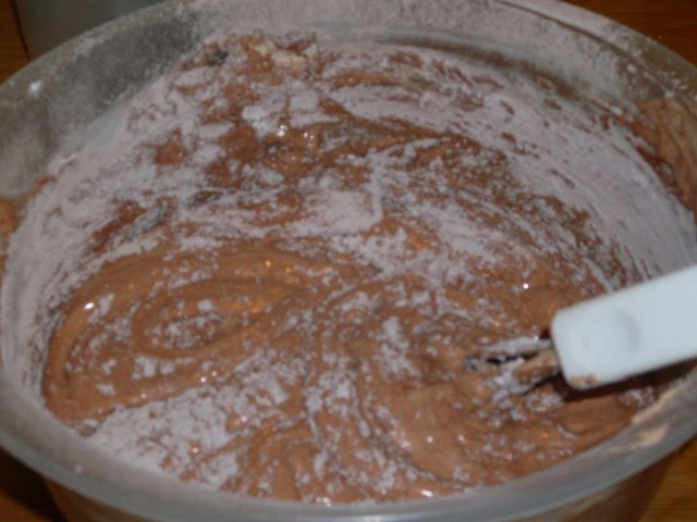 - Към крема добавям и предварително пресятото и смесено брашно с бакпулвера, нишестето и какаото