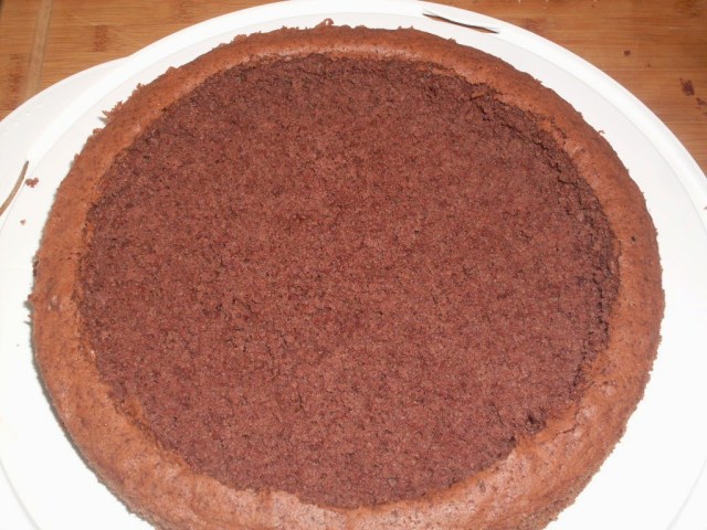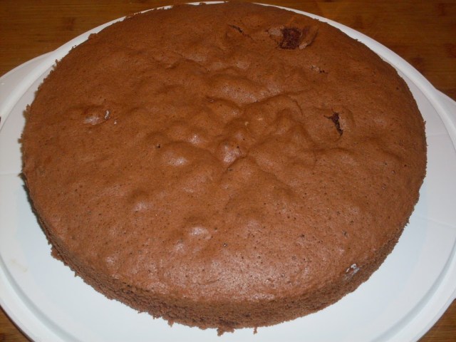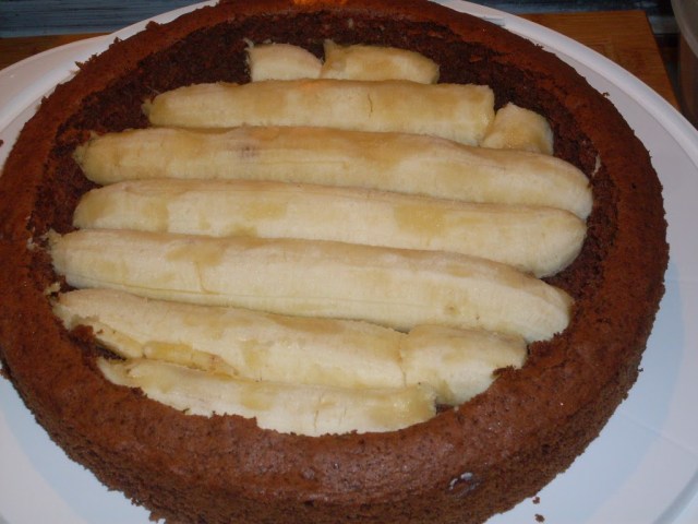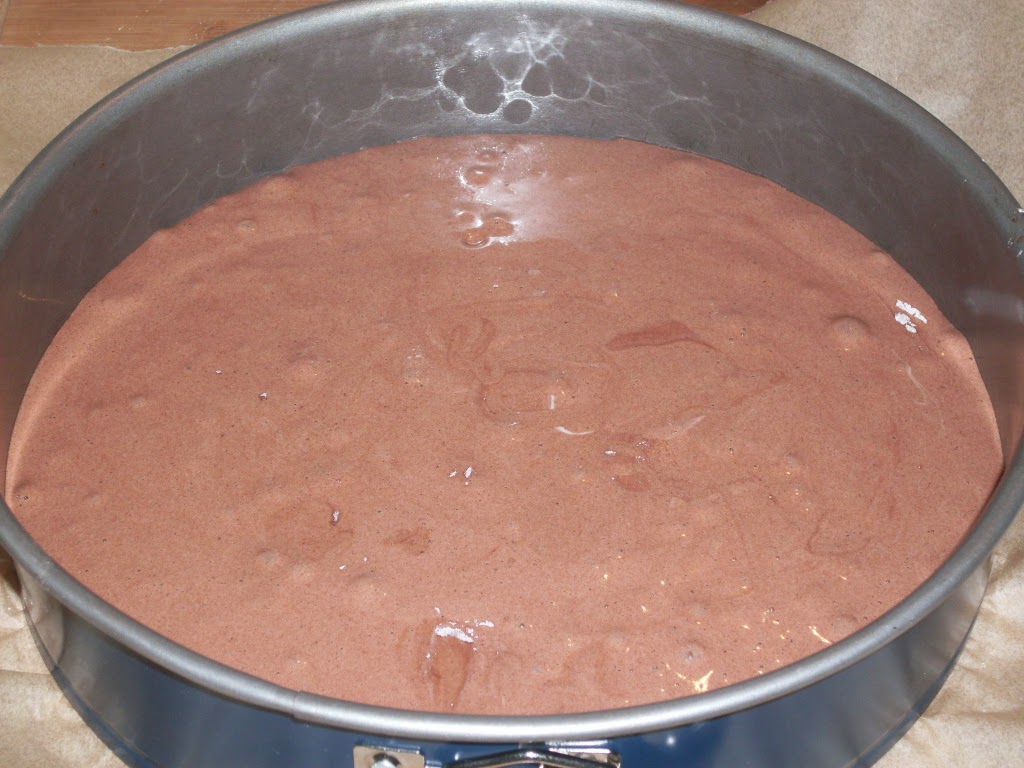 - Добре обърканото тесто изливам във формата за торта. Моята е с размер 24 см. в диаметър, но продуктите са достатъчни и за форма с размер 26 см. в диаметър.