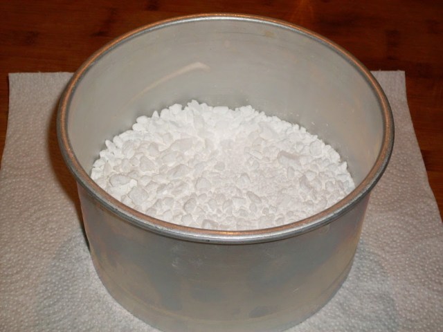 - Върху домакинска хартия пресях пудрата захар, предварително размесена с втвърдителя за сметана и ако използвам желиращата захар.