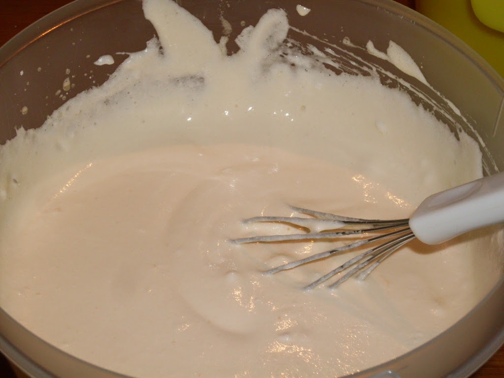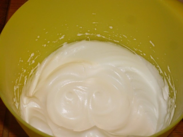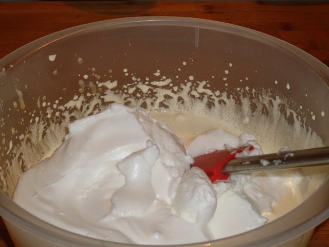 - Добавям разбитите на сняг белтъци към жълтъците и разбърквам съвсем бавно и внимателно, докато се получи пухкав и гладък крем. Трябва да е бавно разбъркването, за да не спаднат белтъците.
