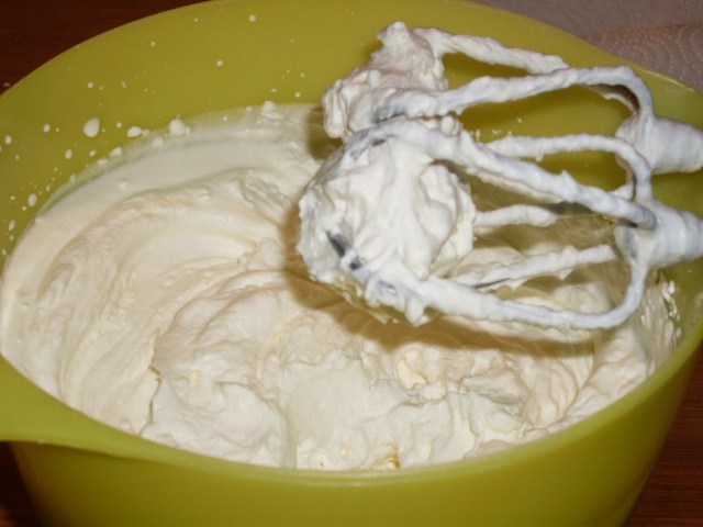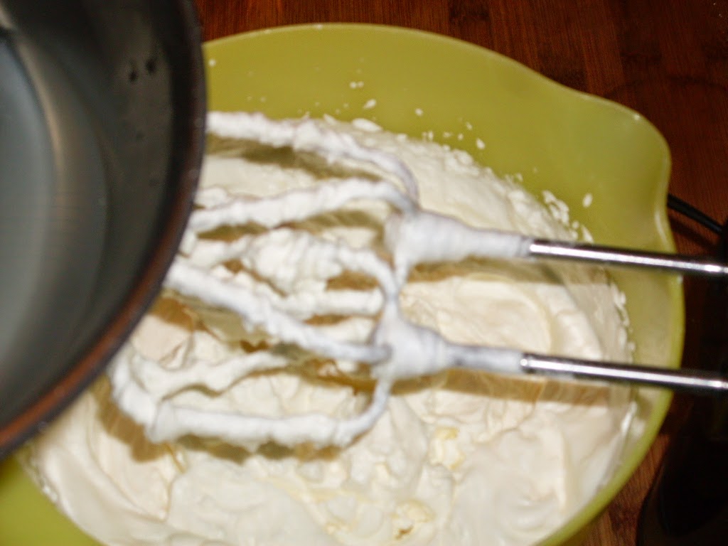 - Разбивам сметаната с миксер и много бавно – на тънка струйка, добавям разтворения желатин.
