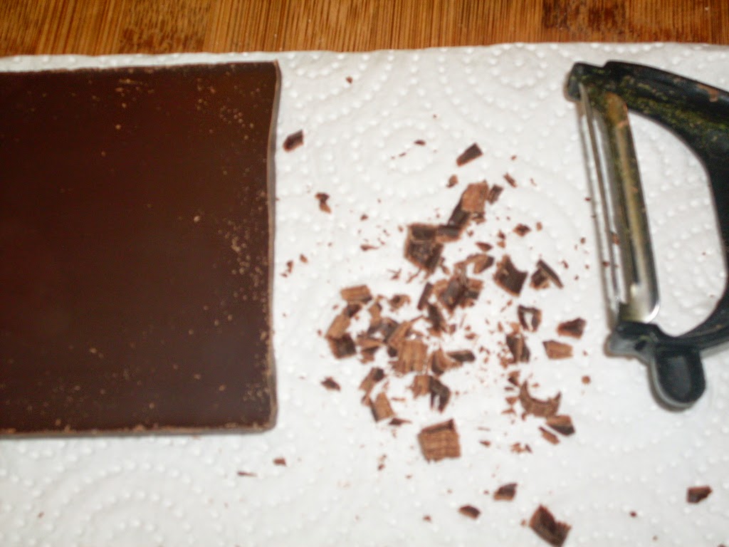 - Черният шоколад настъргвам на едри парчета с помощта на белачката за краставици. Може и само да бъде начупен на ситни парченца.