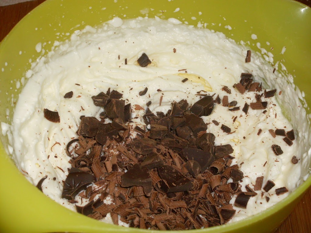 - Добавям едрите шоколадови стърготини към сметановата смес и разбърквам леко.