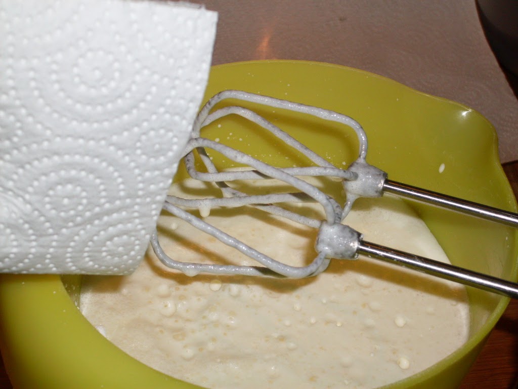 - Аз започвам винаги с разбиването на белтъците, защото накрайниците на миксера са все още чисти и сухи. За доброто разбиване на белтъците е много важно, купата и накрайниците на миксера да са чисти и сухи. Започвам да разбивам белтъците на минимална степен на миксера, докато леко побелеят. Увеличавам постепенно мощността и започвам много бавно да добавям към тях само 2 – 3 супени лъжици от захарта. Разбивам белтъците докато започнат да остават черти. Проверявам готовността им, като обърна купата надолу с отвора и белтъците не се разтичат.