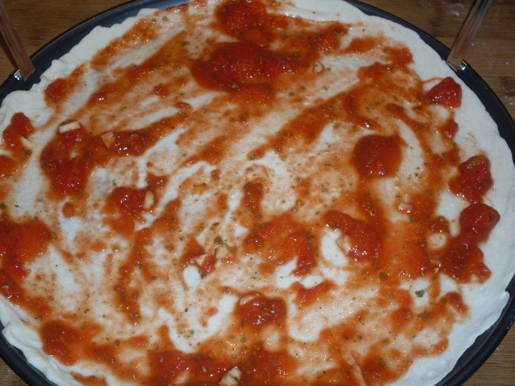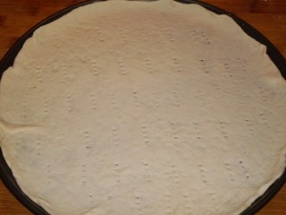 - Разстилам тестото в тавичка за пица. Ако тестото е стояло в хладилника, е нужно да престои за около 15 мин. на стайна температура, за да се отпусне и по-лесно да се разточи на кръгла кора.