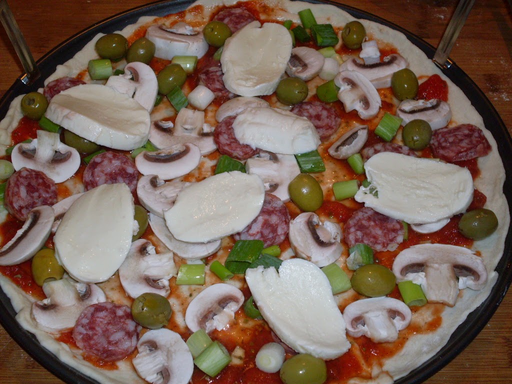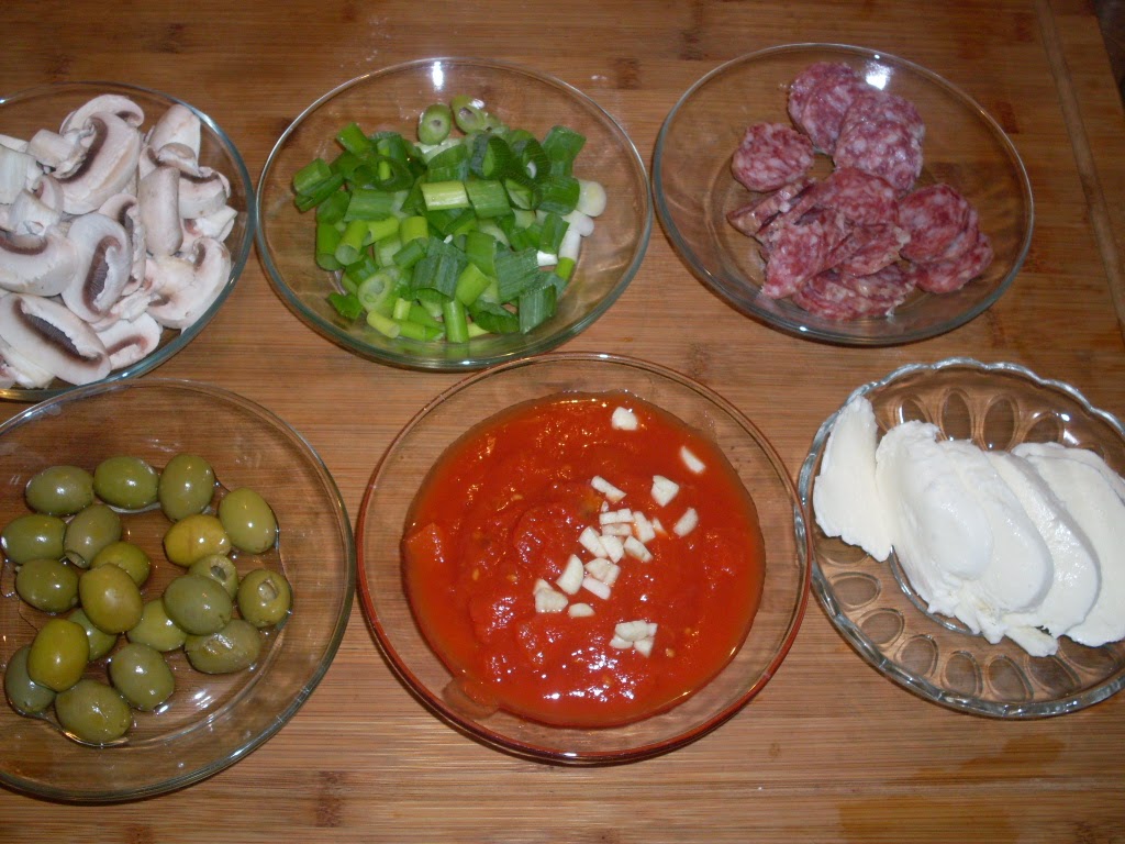 - Зеленият лук, гъбите, шпековият салам и маслините /моите са зелени, защото са ми по-вкусни от черните маслини/ подреждам равномерно върху доматите.