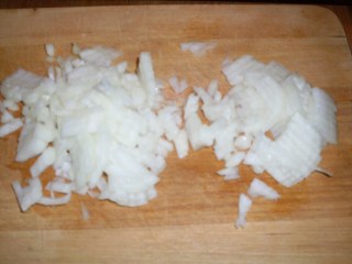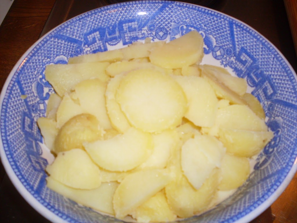 - Сварените картофи обелвам и нарязвам на тънки филийки и слагам в купа.