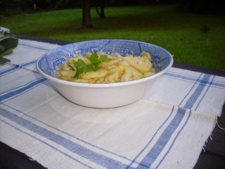 С голямо вълнение описвам направата на тази вкусна Баварска картофена салата, защото рецептата е на Frank Nadler, мой приятел германец – живеещ от 20 години в Банско. Това е един човек с много изтъчен вкус, човек запознат много добре с кулинарията! Благодаря ти, Франк! Салатата е много вкусна! Надявам се да съм спазила всичките ти насоки! Дано на снимката да се вижда и блясъкът на картофките, след заливането със соса!
